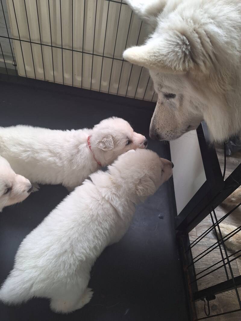 Volcan bekijkt zijn 1e nest. De kleine K9's zijn onder de indruk van hun vader.